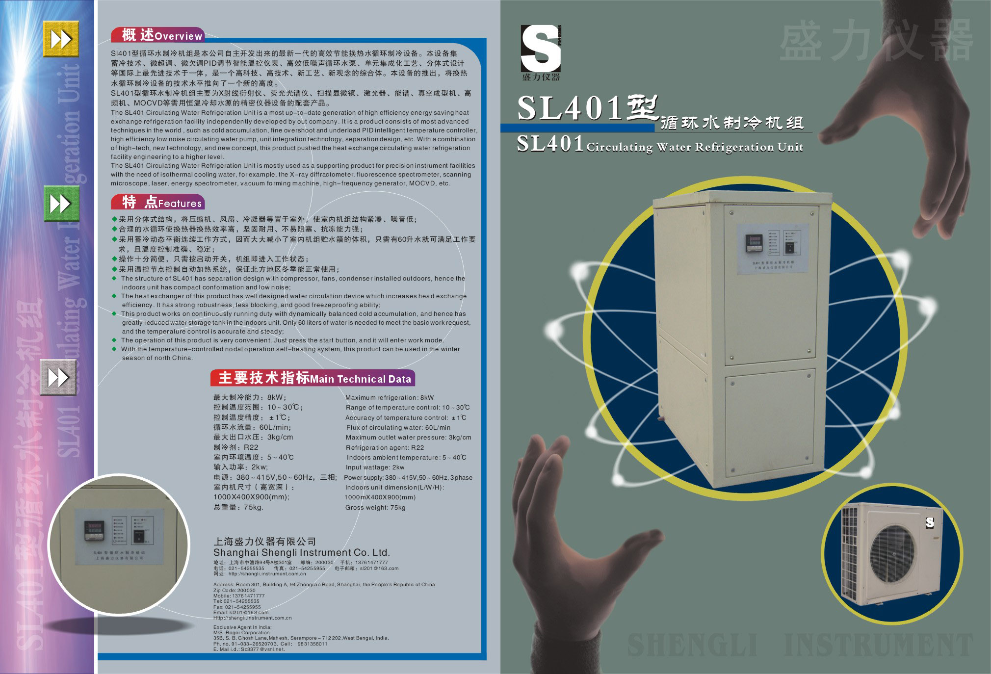 SL401型循环水制冷机组主要为X射线衍射仪、荧光光谱仪、扫描显微镜、激光器、能谱、真空成型机、高频机、MOCVD等需用恒温冷却水源的精密仪器设备的配套产品。