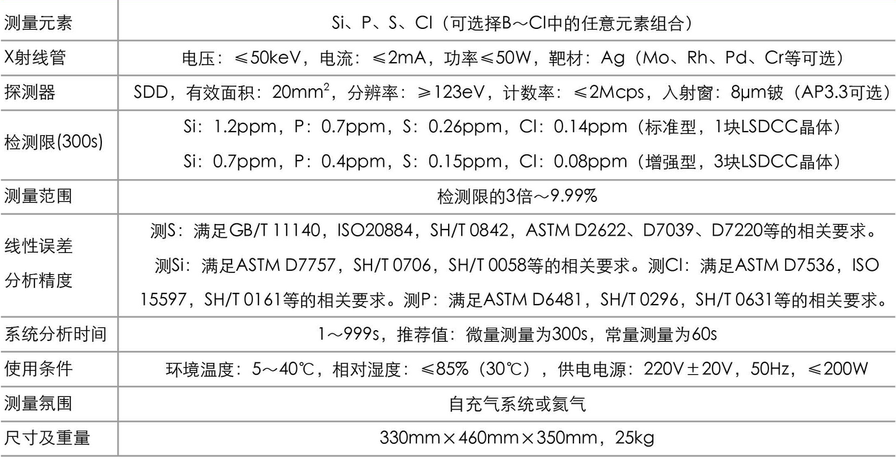 适用于炼油厂、检测及认证机构、油库、实验室测量范围从0.5ppm到10%的各种油品(如汽油、柴油、重油、残渣燃料油等)、添加剂、含添加剂润滑油、以及炼化过程中的产品。