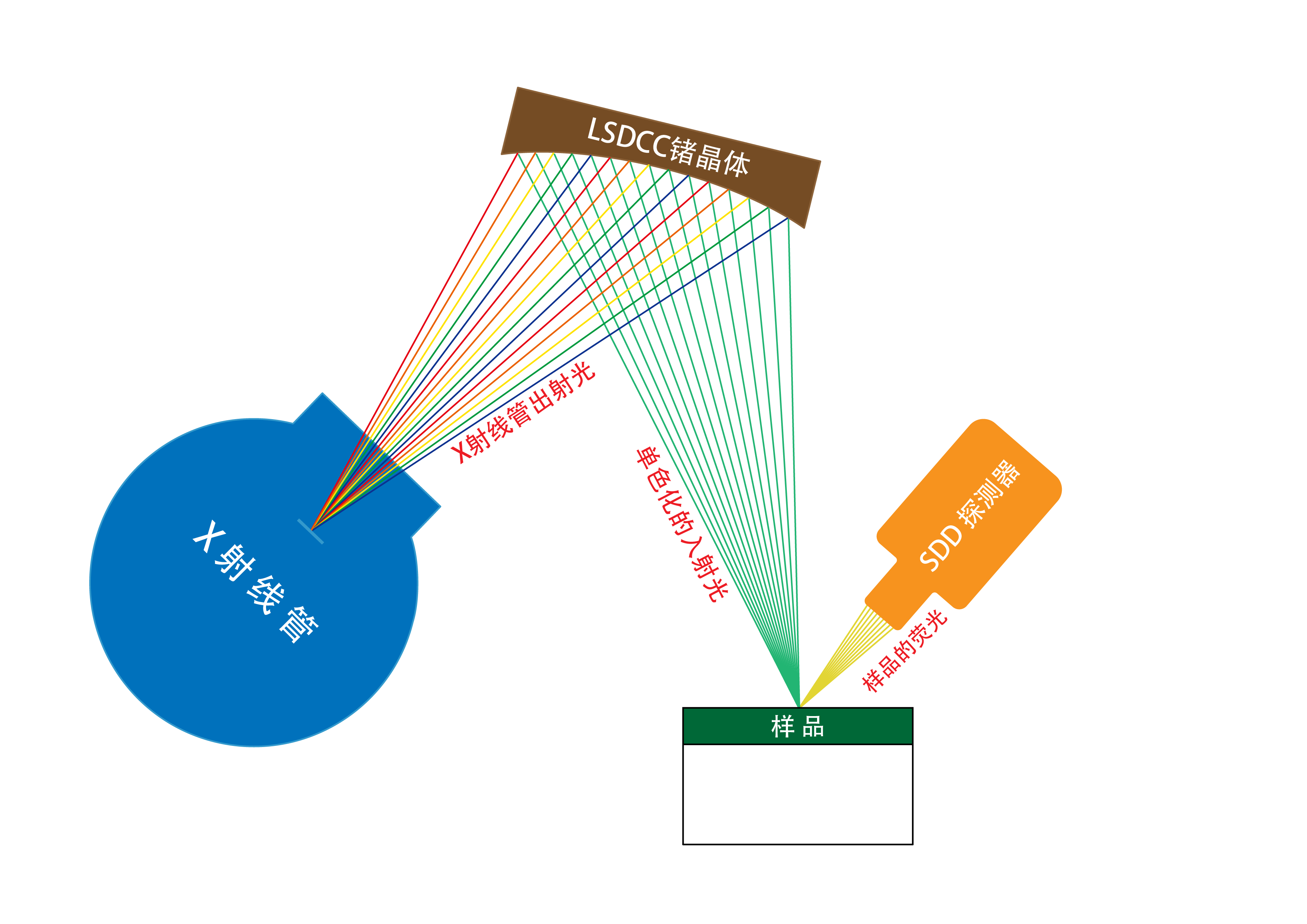 单色激发能量色散X射线荧光(Monochromatic Excitation Beam Energy Dispersive X-Ray Fluorescence)分析技术,就是采用光学器件将X射线光管出射谱单色化,进而使得荧光光谱的连续散射背景极大地降低,同时尽可能少的降低甚至于可能的话增加所需激发X射线的单色化的线或窄能量带的强度,从而大大提高所测元素X射线荧光光谱的峰背比,实现超轻元素的准确测量。其原理图如图1。
