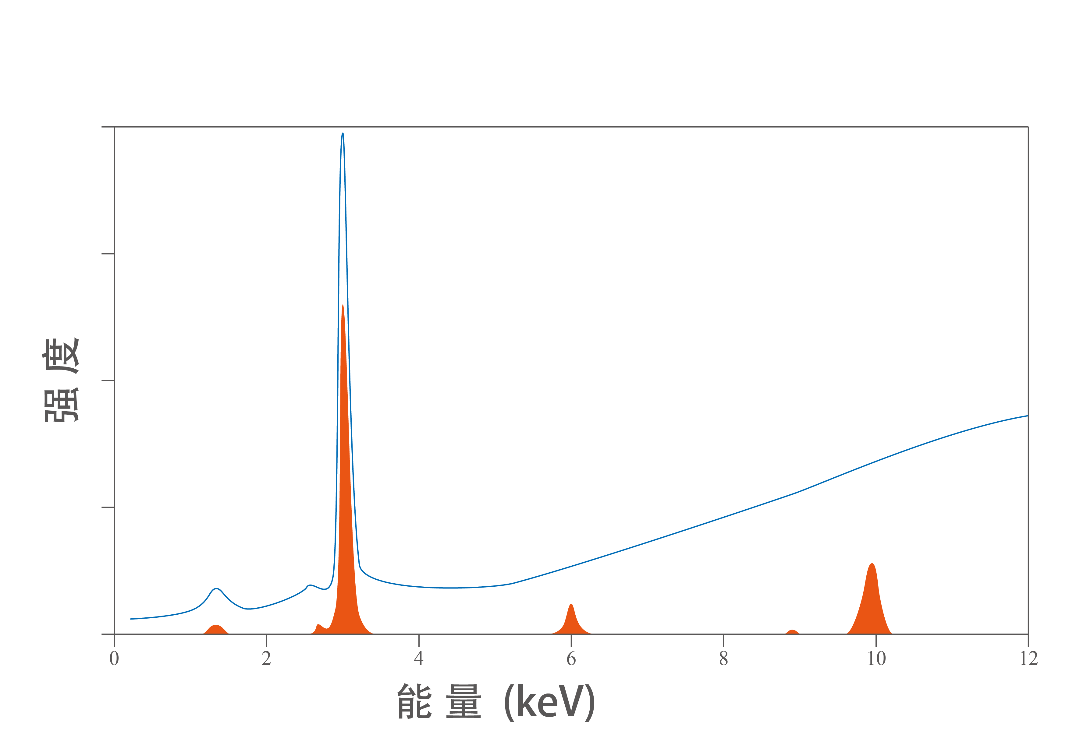 X射线探测器的种类有很多,其中硅漂移探测器SDD是最好的,其分辨率一般小于140eV,是波长色散的5倍左右。而单色激发能将背景下降一个数量级,所以理论上讲如果没有谱线重叠干扰,则单色激发能量色散的峰背比好于一般的波长色散的。